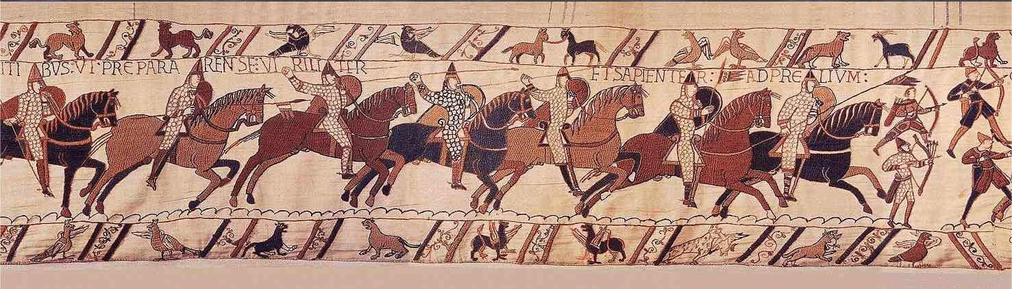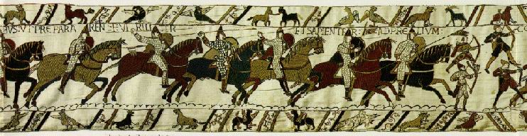 Les troupe normandes, "gonflées à bloc" par les paroles de Guillaume, se précipitent sur l'armée saxonne. Parmis les cavaliers, les archers normands, réputés pour leur adresse et leur courage, décochent les premières flèches.